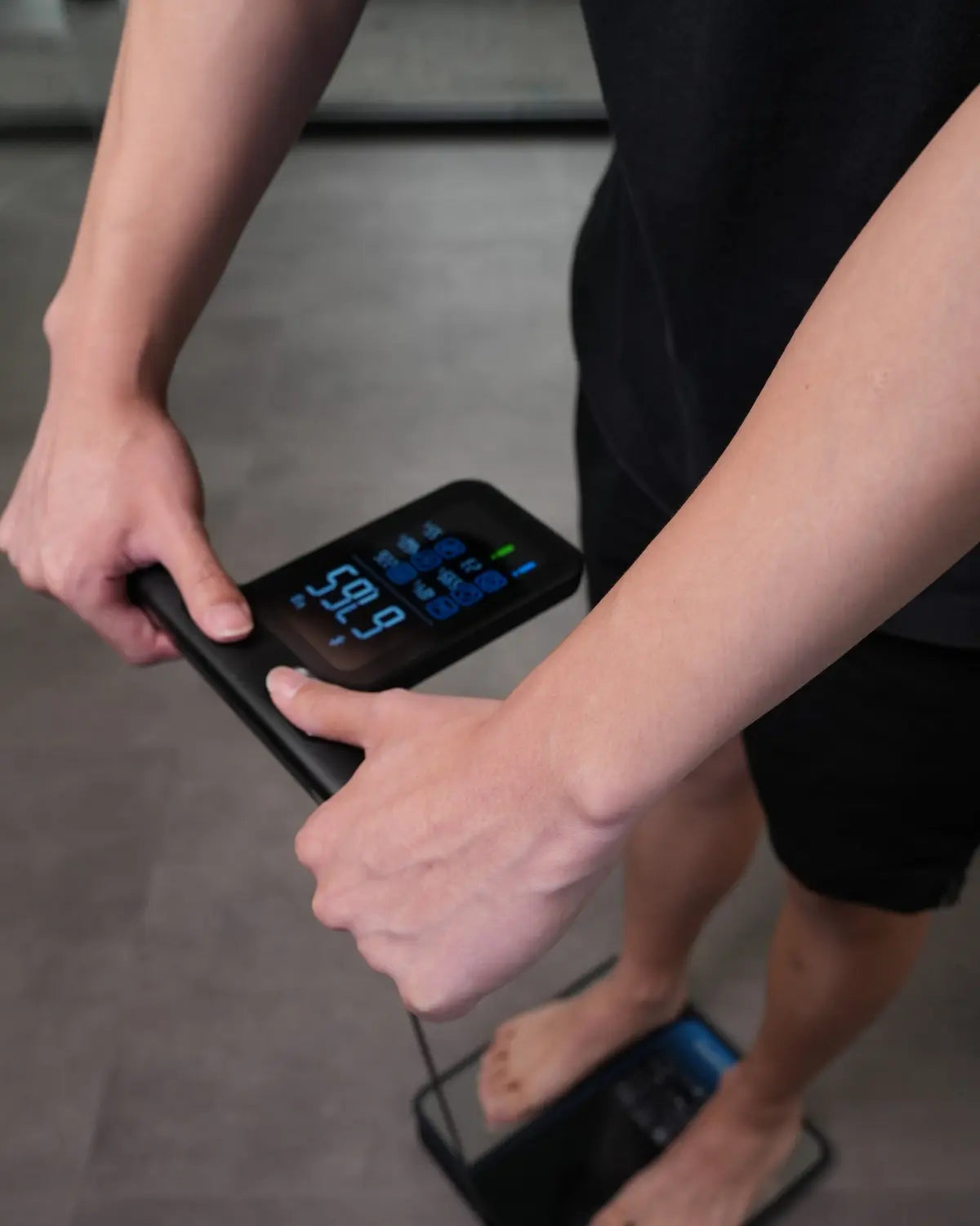 Die erste intelligente Premium-Waage mit 8 BIA-Sensorelektroden: 4 auf der Waagenplattform, 4 am einziehbaren Griff. Diese zusätzlichen Kontaktpunkte ermöglichen eine umfassendere und genauere Messung von über 50 Körpermaßen.
